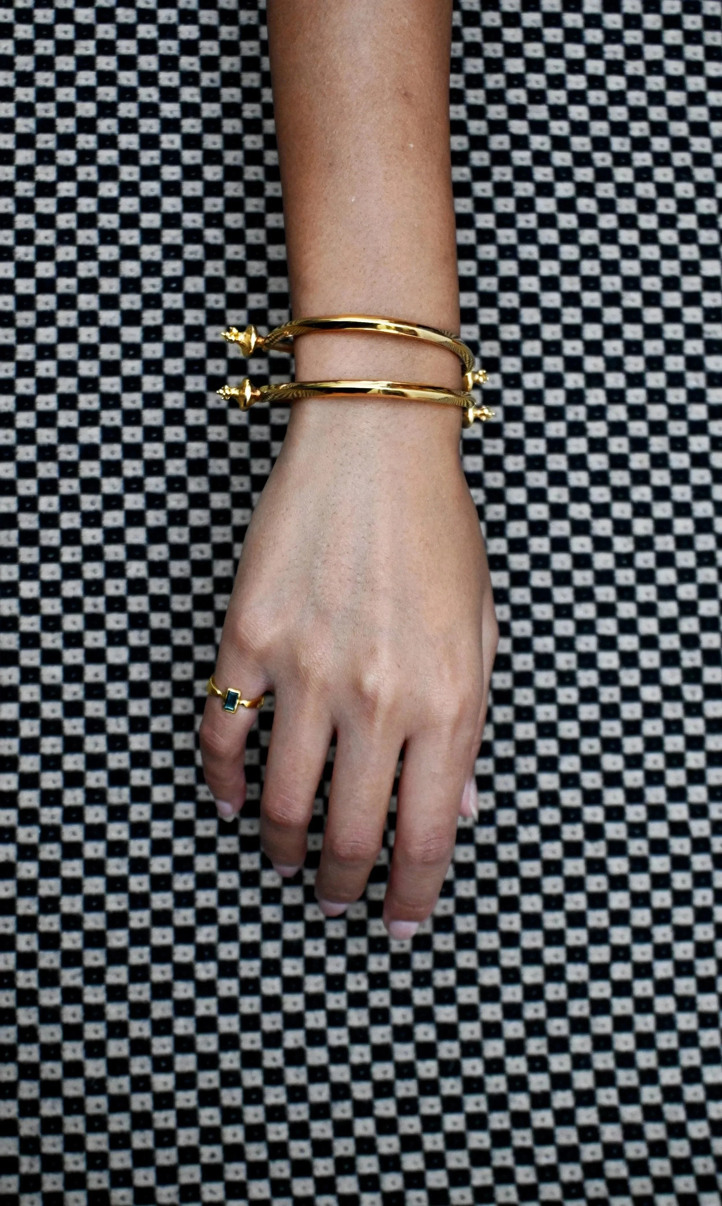 Solid brass wrist adornments inspired by vintage hand cuffs and south Asian motifs.
